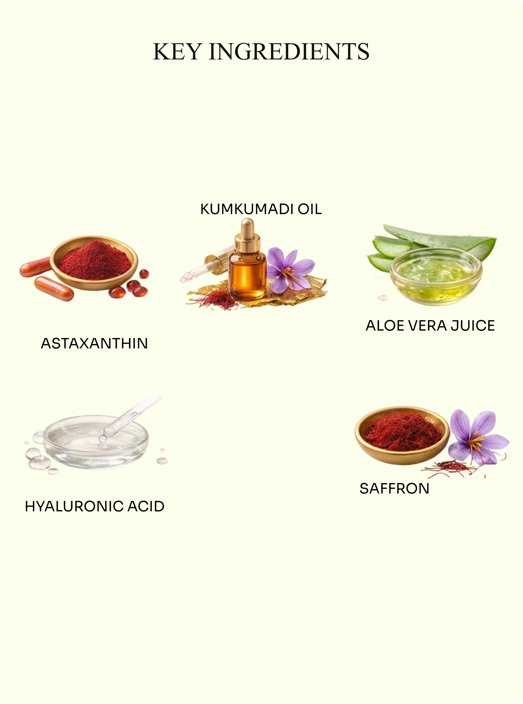 Jojoba Oil, Wheat Germ Oil, Aloe Vera Juice Infused with Powders of Shiitake Mushroom, Kumkumadi Oil (24 Herbs Infused Oil), Rose Oil, Saffron, Purslane & Rice, Astaxanthin, Hyaluronic Acid, Cetearyl Alcohol, Stearic Acid, Xanthan Gum, Cetearyl Olivate & Sorbitan Olivate, Cosphaderm & Essential Oils of Holy Basil & Dahlia.