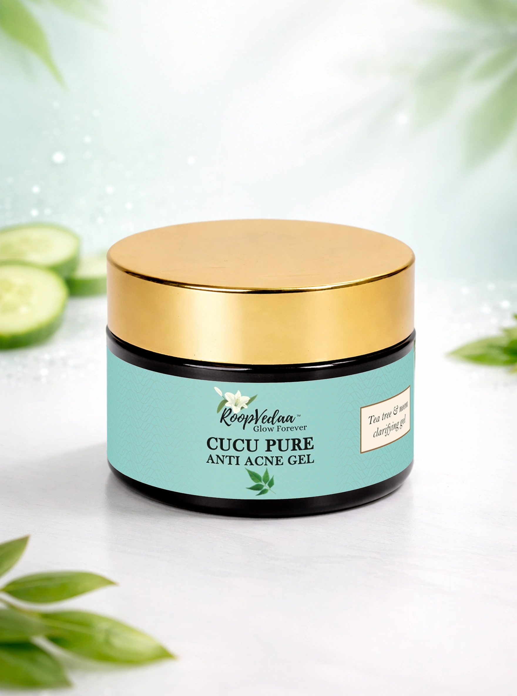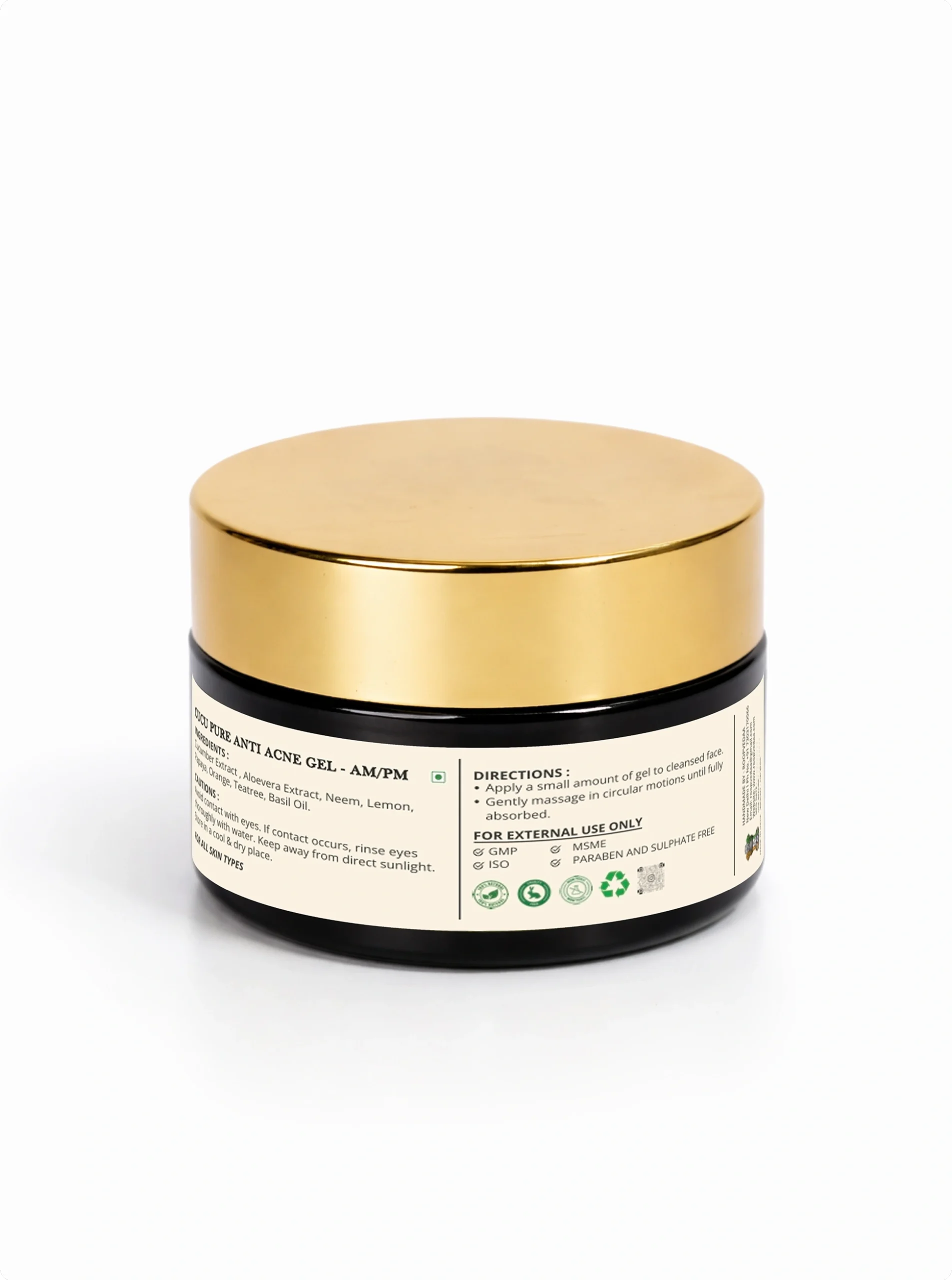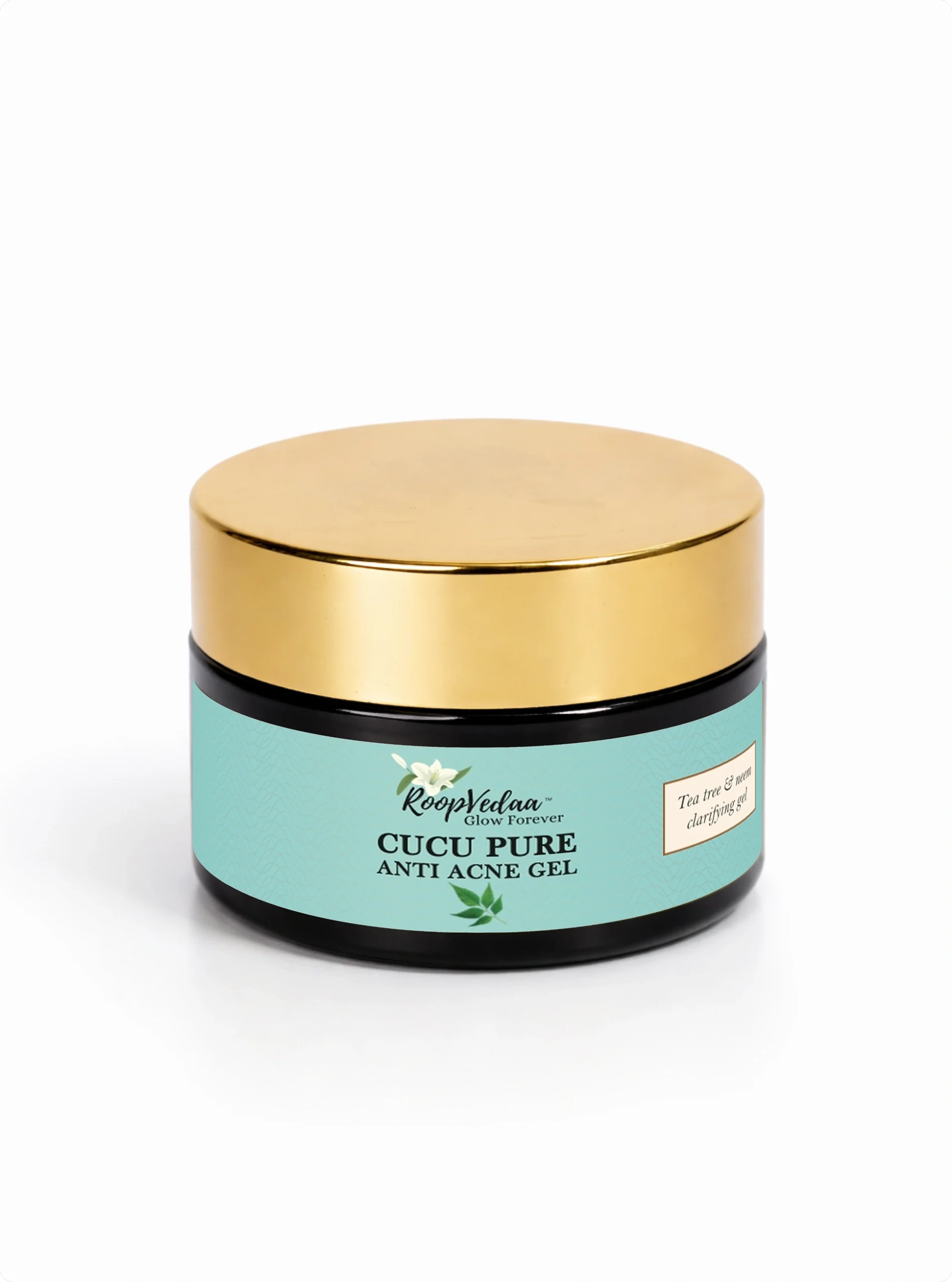 Cucu Pure Anti Acne Gel (AM/PM) is a lightweight, plant-based face gel formulated to help reduce acne, control excess oil, and soothe irritated skin. Powered by natural extracts and essential oils, the gel works by calming inflammation, keeping pores clean, and supporting clearer-looking skin without heavy or greasy residue. Its fast-absorbing texture makes it suitable for daily use in both morning and night skincare routines.