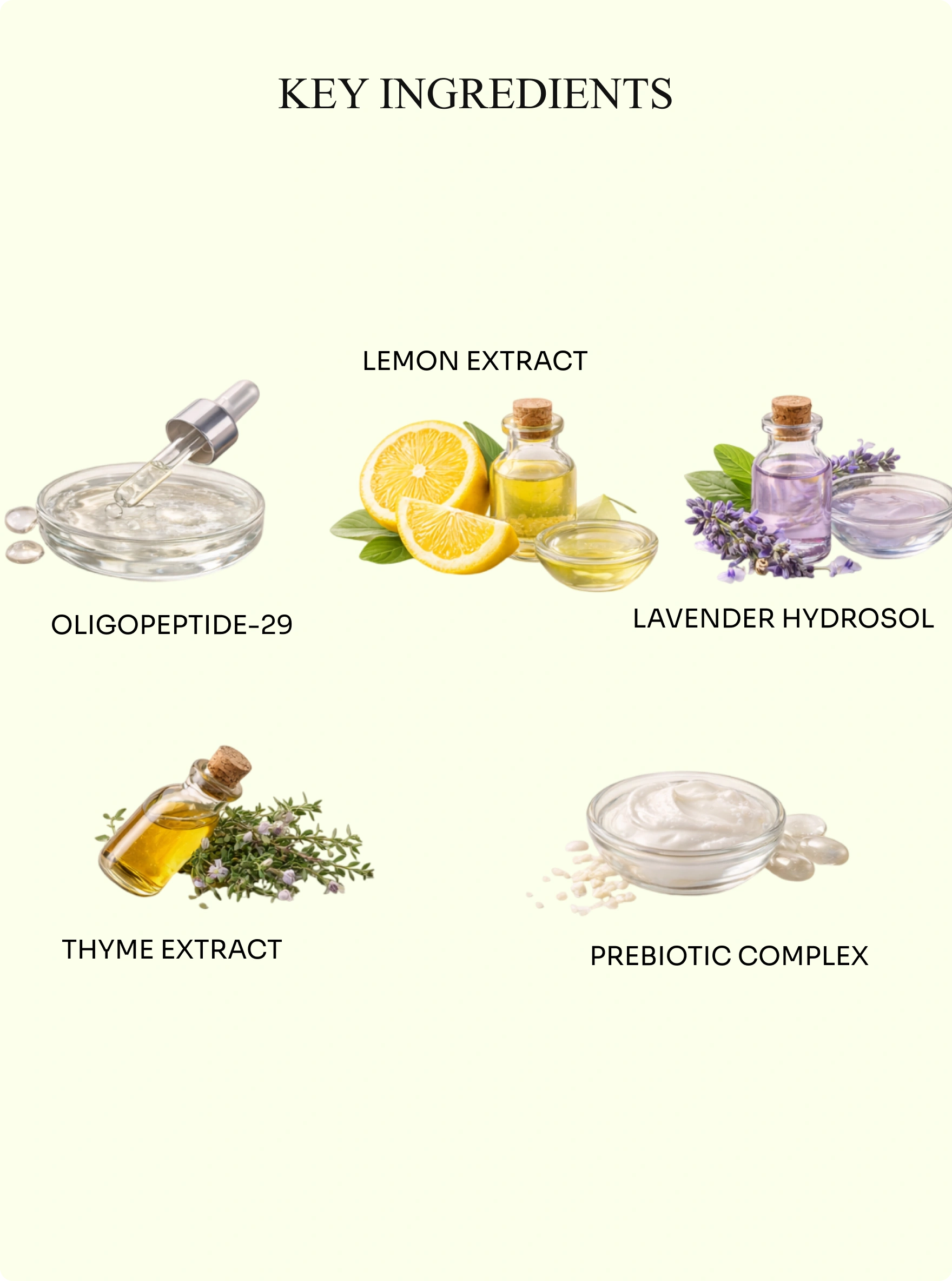 Lemon Extract, Lavender Hydrosol, Thyme Hydrosol, Thyme Extract, Thyme Oil, Lemon Oil, Anti Dandruff Active, Oligopeptide-29, Propanediol Caprylate, Prebiotic, Blends of Essential Oils & Oil Soluble Extracts.