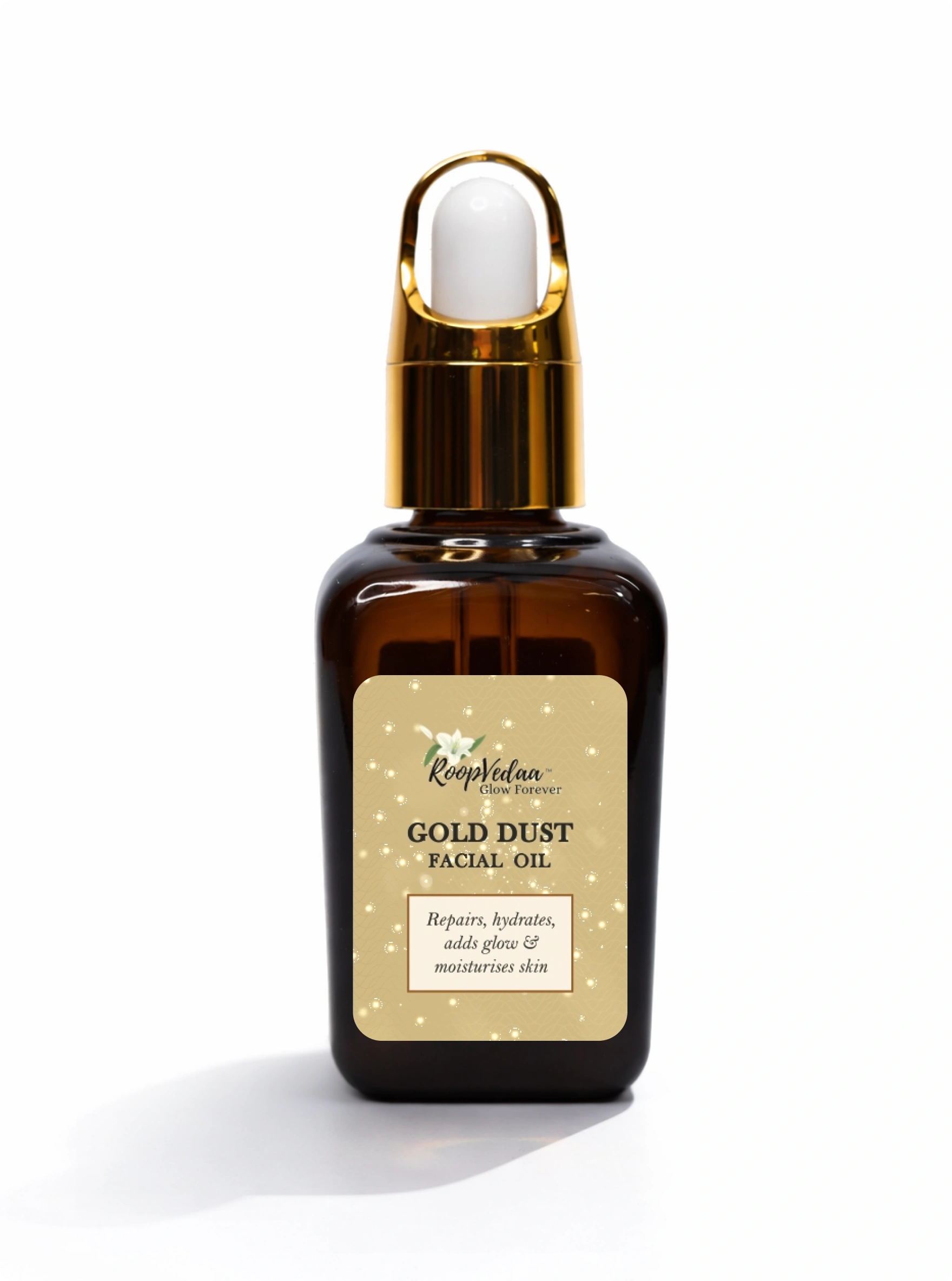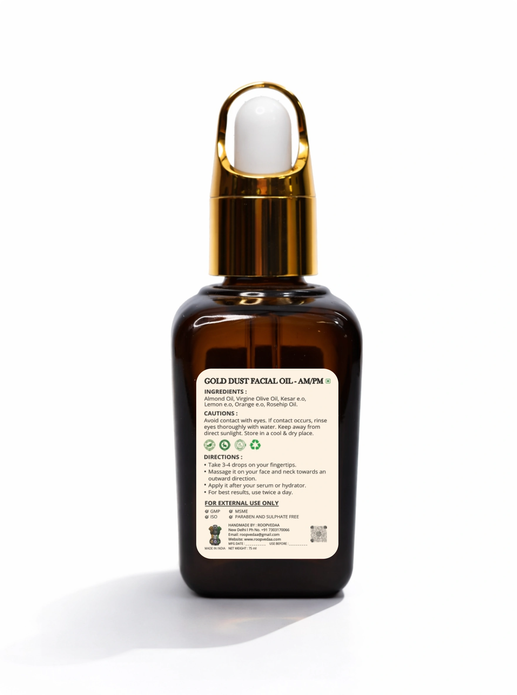 Gold Dust Facial Oil is a handmade facial oil formulated to support skin nourishment and massage-based skincare routines. Crafted with plant-based oils, essential oils, and gold dust, this oil is designed for daily use and works as a leave-in facial oil suitable for both morning and night application. Intended for external use only, it complements regular skincare routines focused on hydration and comfort.