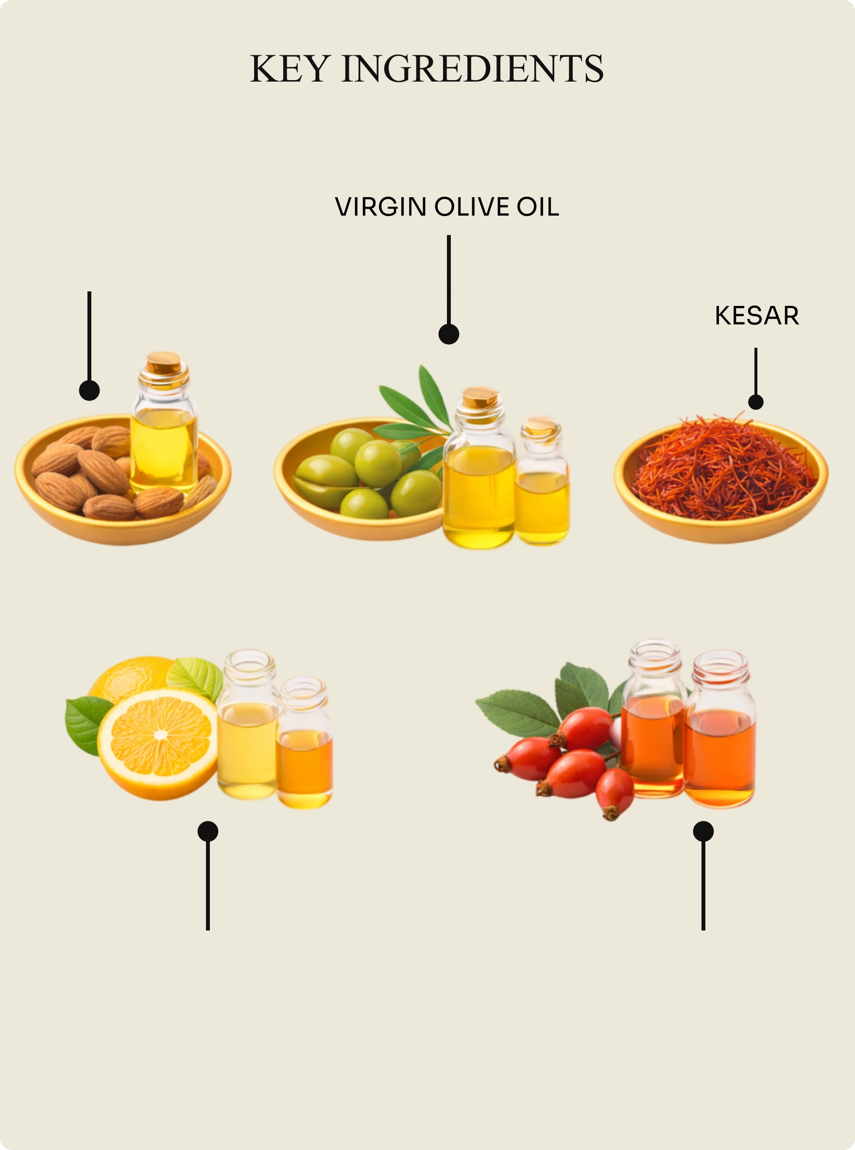 Almond oil, virgin olive oil, kesar essential oil, lemon essential oil, orange essential oil, rosehip oil, and gold dust.