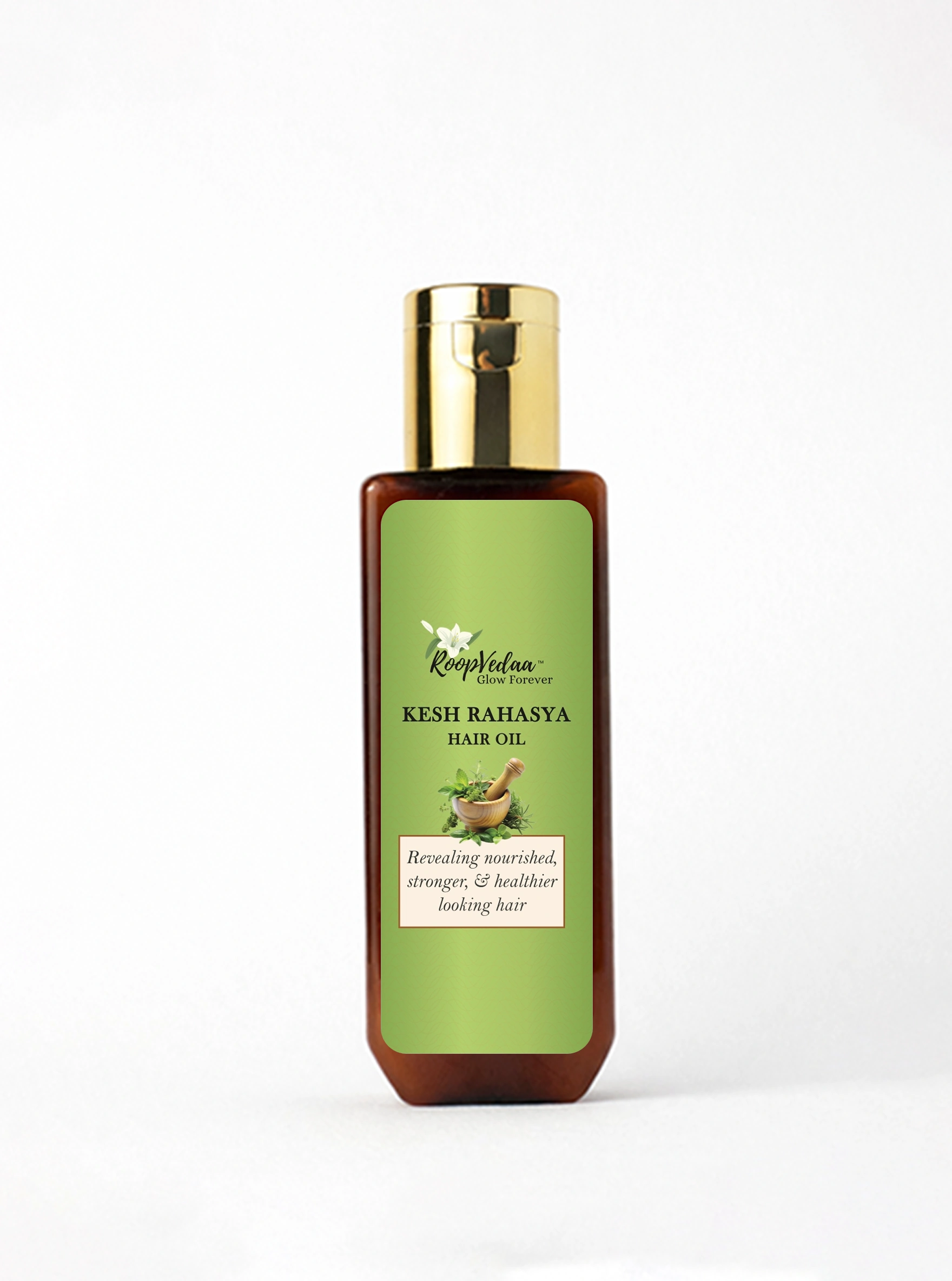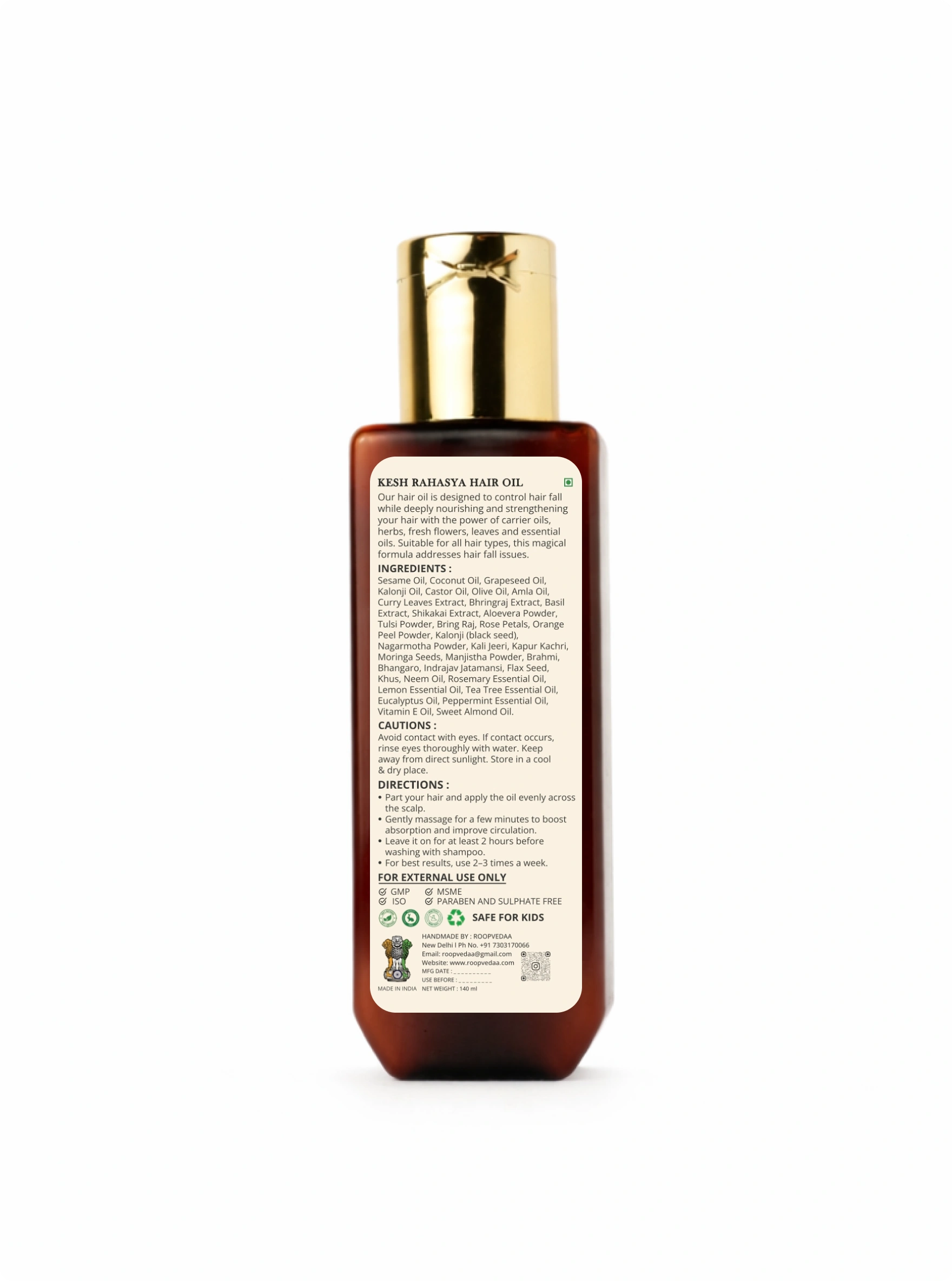 Kesh Rahasya Hair Oil is a deeply nourishing herbal hair oil formulated to support hair strength, scalp nourishment, and reduced hair fall caused by weakness and dryness. Crafted with a blend of carrier oils, Ayurvedic herbs, fresh botanicals, and essential oils, this oil helps improve scalp health, enhance hair texture, and promote stronger, healthier-looking hair with regular use.