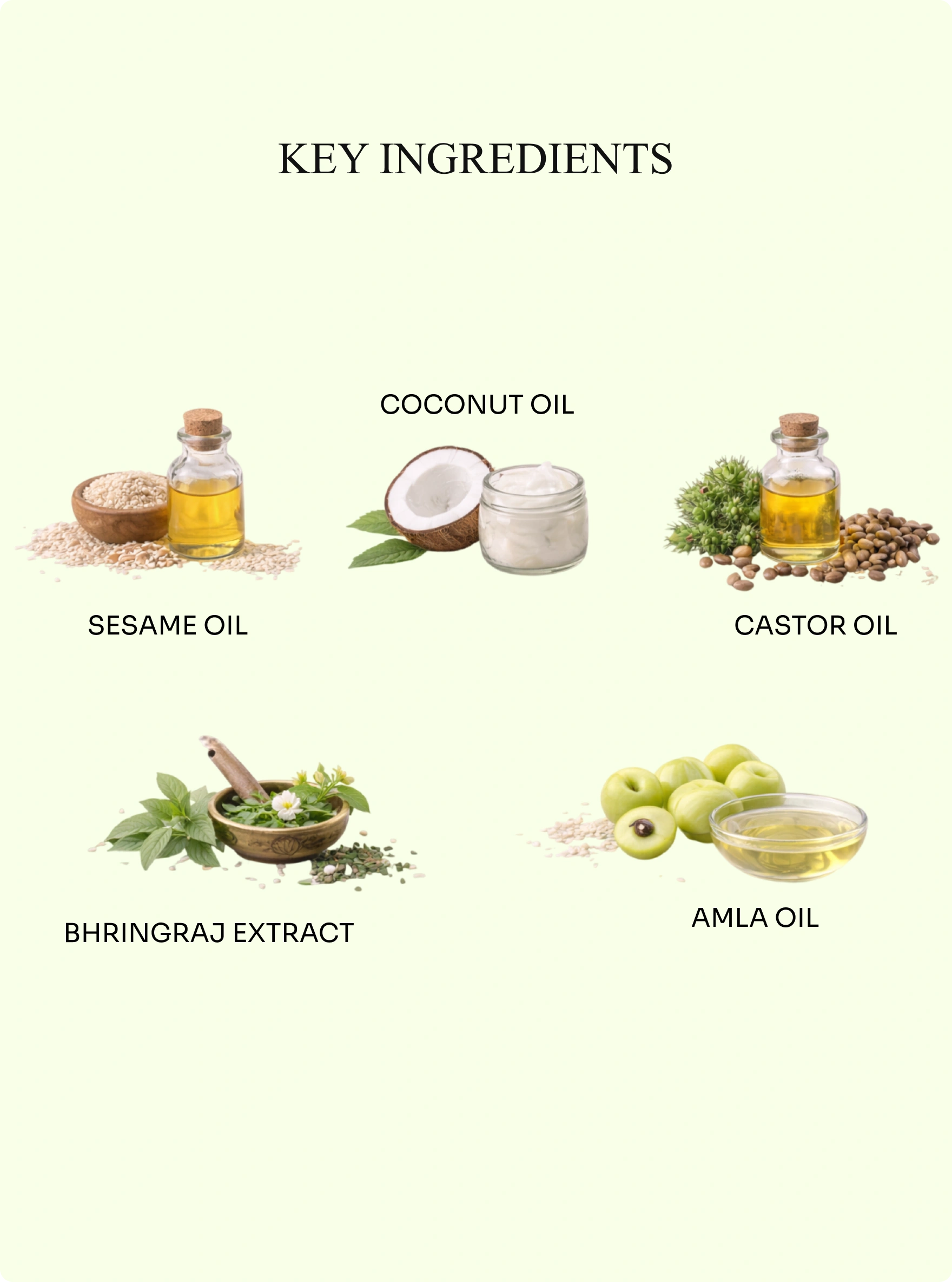 Sesame Oil, Coconut Oil, Grapeseed Oil, Kalonji Oil, Castor Oil, Olive Oil, Amla Oil, Curry Leaves Extract, Bhringraj Extract, Basil Extract, Shikakai Extract, Aloevera Powder, Tulsi Powder, Bring Raj, Rose Petals, Orange Peel Powder, Kalonji (Black Seed), Nagarmotha Powder, Kali Jeeri, Kapur Kachri, Moringa Seeds, Manjistha Powder, Brahmi, Bhangaro, Indrajav Jatamansi, Flax Seed, Khus, Neem Oil, Rosemary Essential Oil, Lemon Essential Oil, Tea Tree Essential Oil, Eucalyptus Oil, Peppermint Essential Oil, Vitamin E Oil, Sweet Almond Oil.