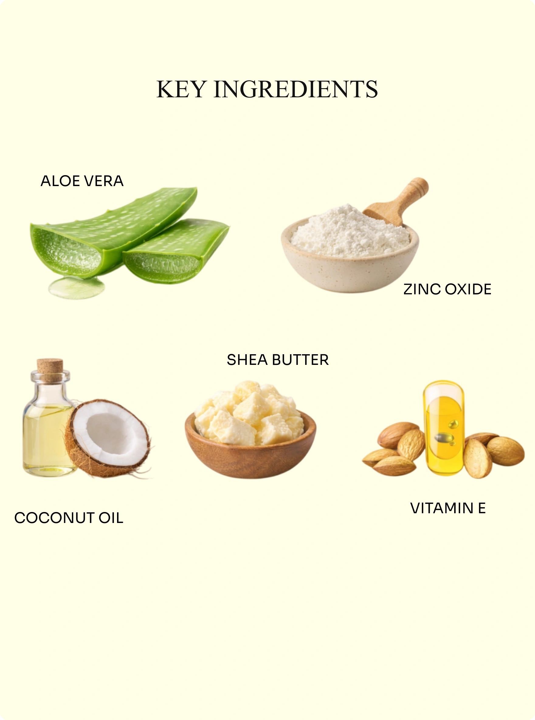 Aloe Vera Extract, Coconut Oil, Shea Butter, Zinc Oxide (Natural Mineral Sunscreen), Green Tea Extract, Chamomile Extract, Vitamin E, Sunflower Oil.