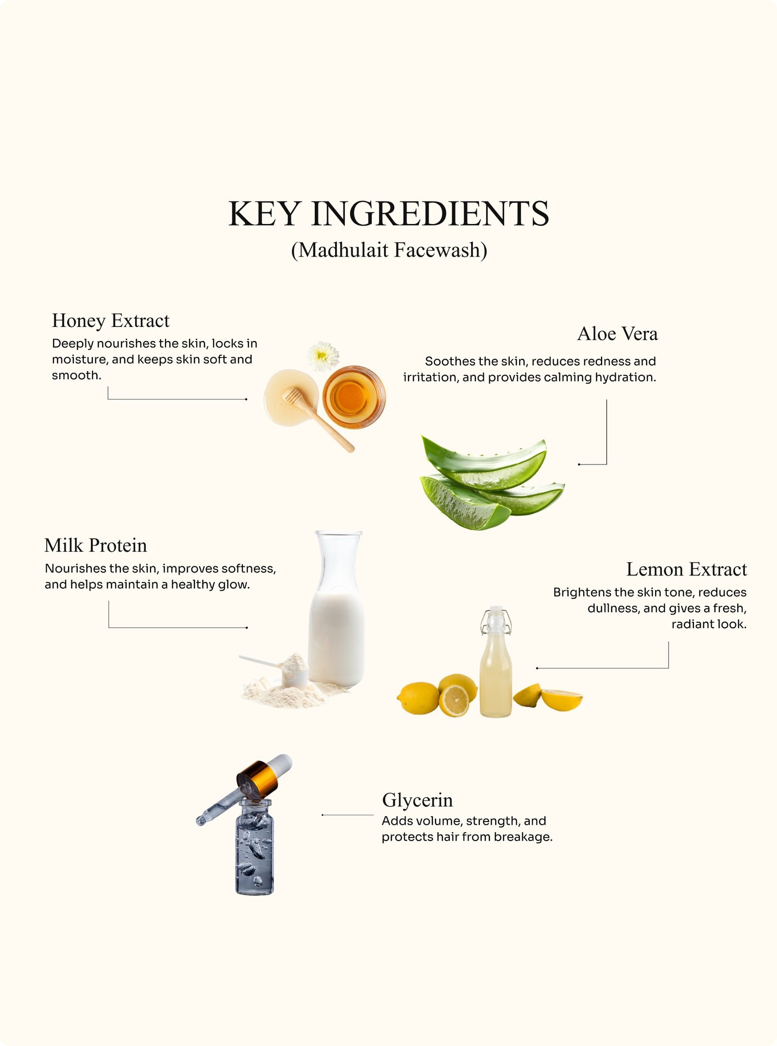 Madhulait Honey Milk Facewash is a rich, creamy cleanser specially designed to deeply hydrate, nourish, and comfort dry skin. Infused with pure Honey, Milk Protein, Aloe Vera, Glycerin, Hyaluronic Acid, Vitamin B5, and soothing actives, it gently removes dirt and impurities without stripping the skin’s natural moisture. Its moisturizing formula helps soften the skin, improve smoothness, and restore a healthy glow, leaving the face fresh, supple, and well-nourished after every wash. Ideal for daily use, it supports healthier-looking, hydrated skin with a soothing cleansing experience.