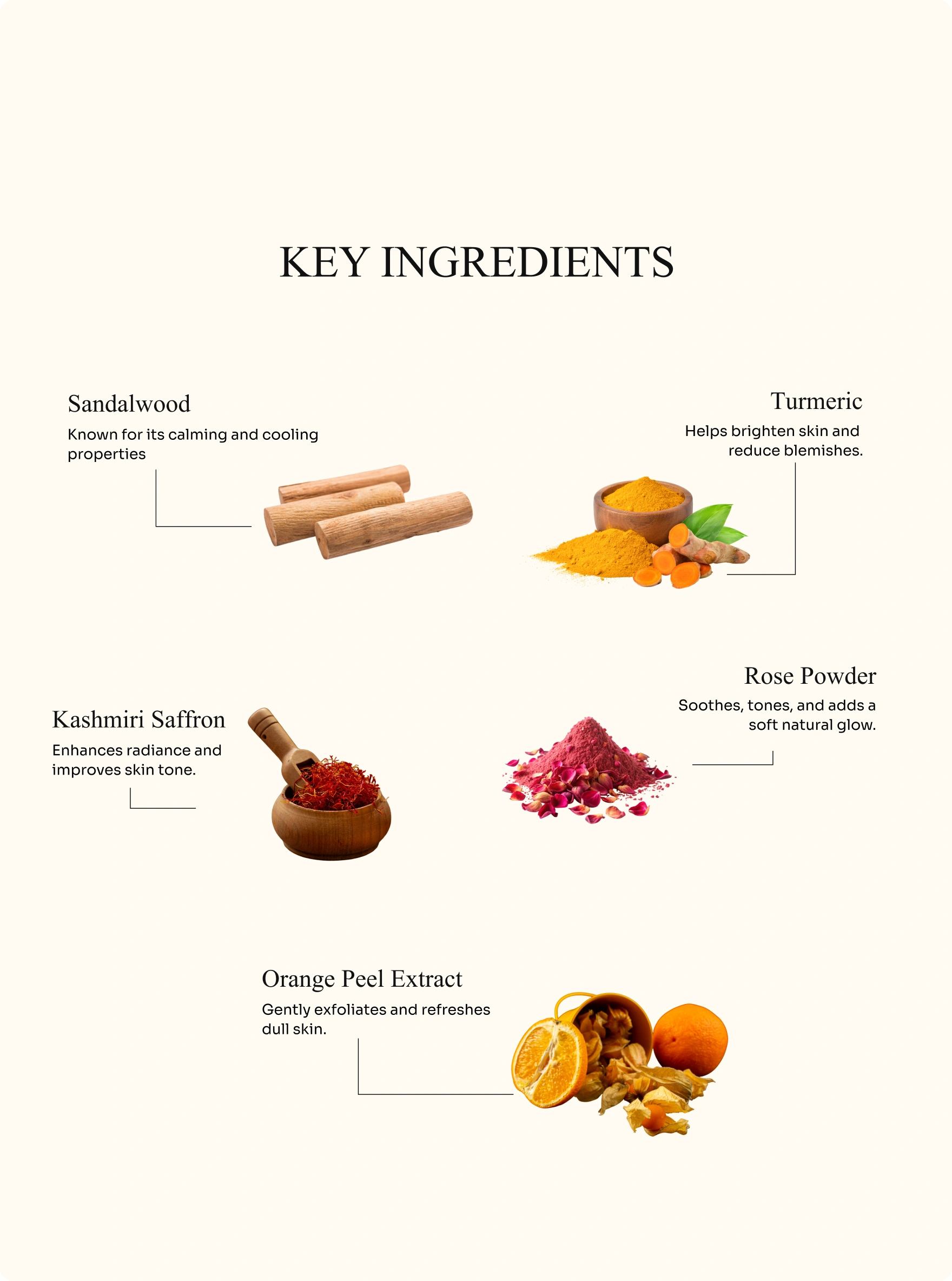 Turmeric, Kumkumadi Tailam, Saffron, Orange Peel Extract, Rose Powder