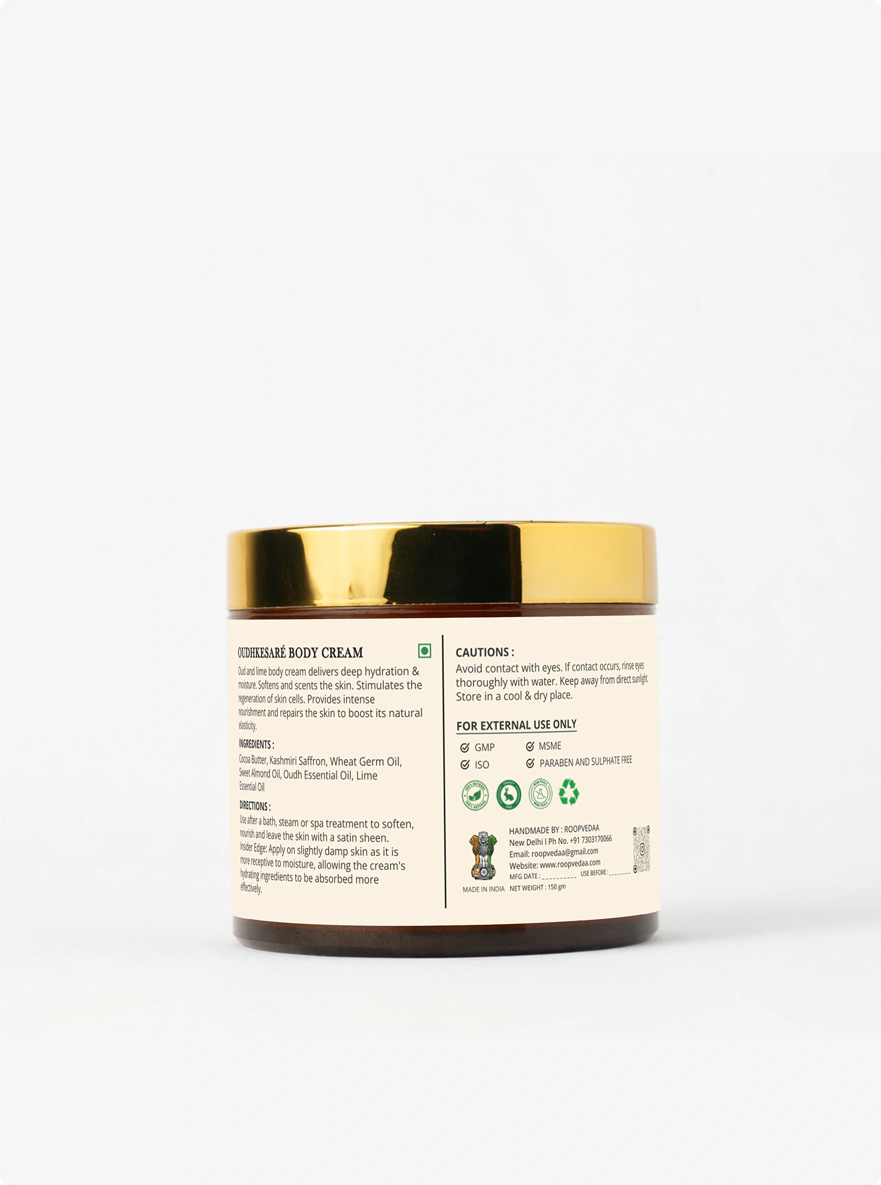 Oudhkesaré Body Cream is a rich, deeply nourishing body cream formulated to deliver intense hydration, improve skin softness, and enhance natural elasticity. Infused with luxurious oud and refreshing lime, this cream helps moisturize dry skin, improve skin comfort, and leave the body delicately scented with a warm, elegant fragrance. Ideal for daily body care to maintain smooth, supple skin.
