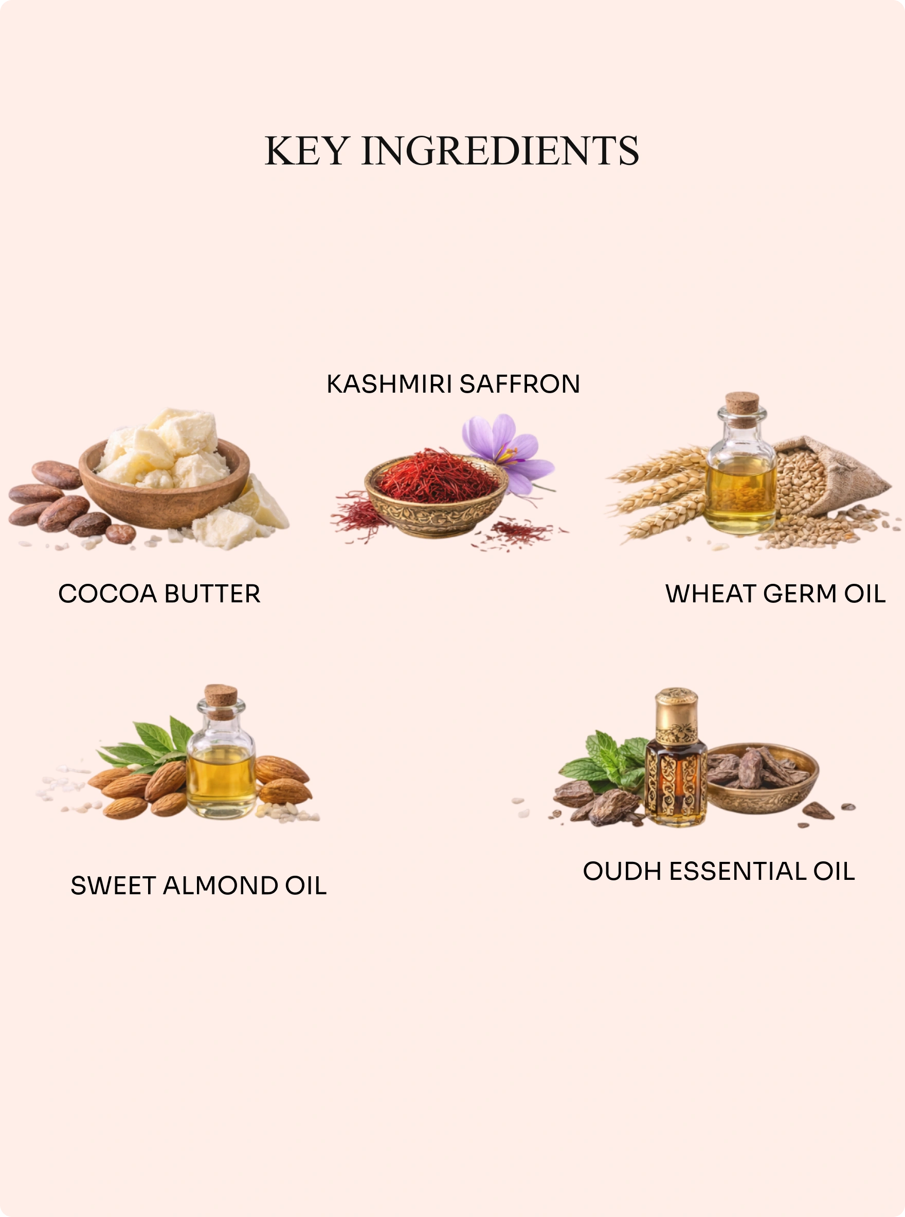 Cocoa Butter, Kashmiri Saffron, Wheat Germ Oil, Sweet Almond Oil, Oudh Essential Oil, Lime Essential Oil.
