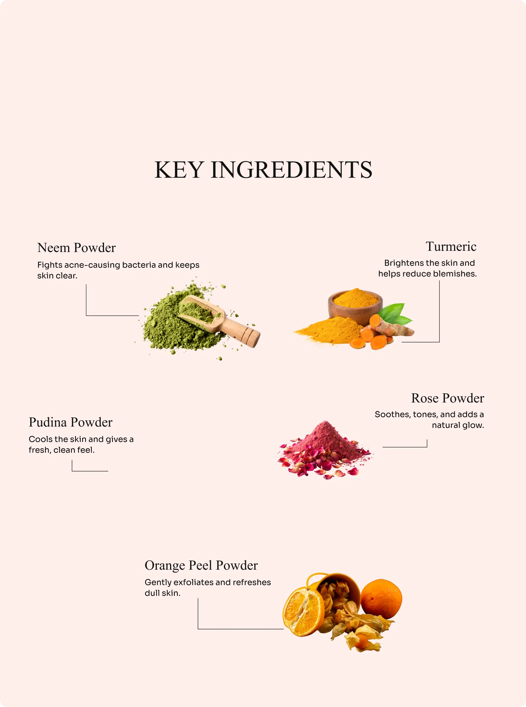 - Neem Powder – A natural purifier with antibacterial properties that helps control breakouts and detoxify the skin.