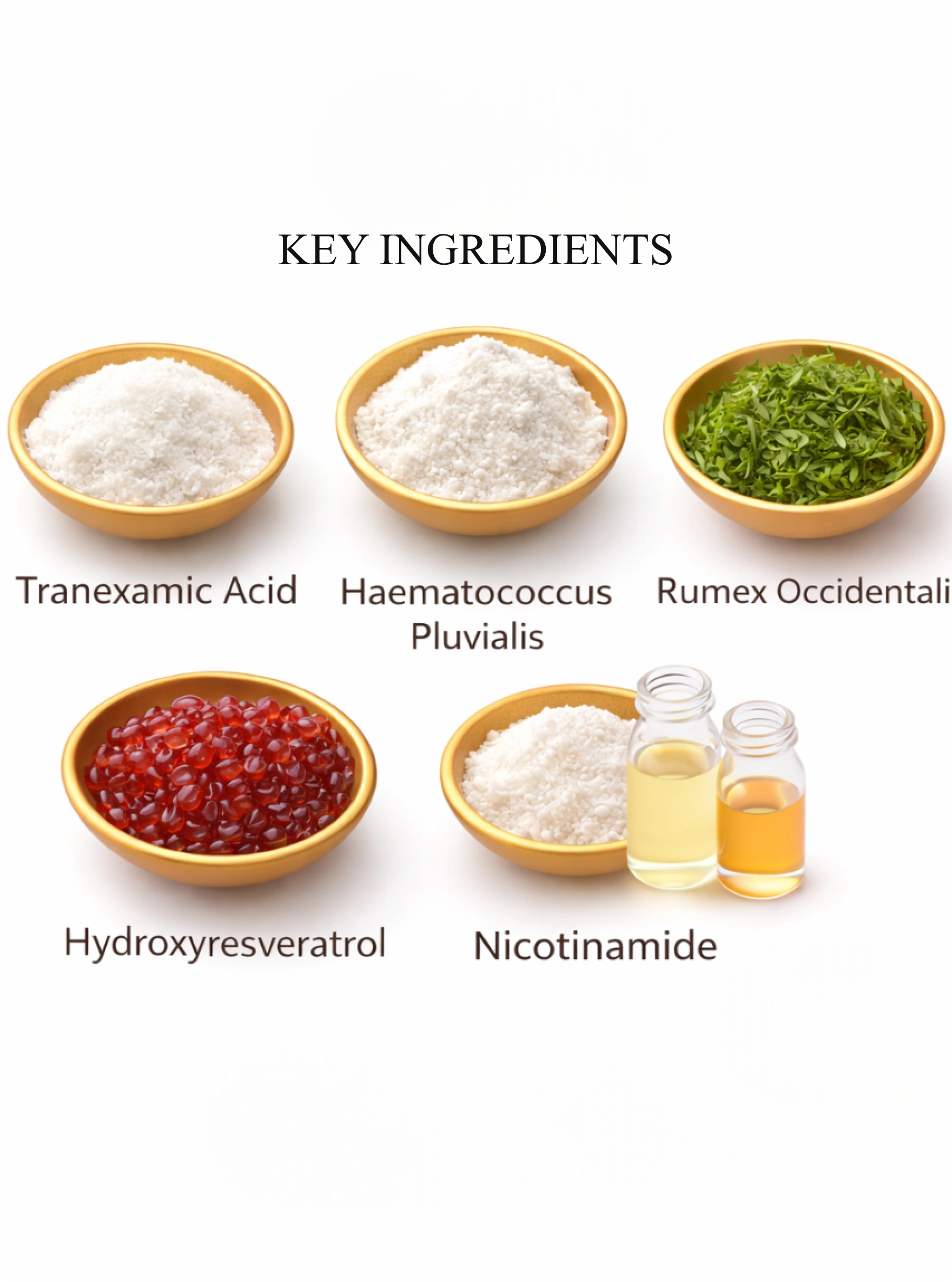 Water, methyl gluceth 20, propanediol, tranexamic acid, dimethyl isosorbide, haematococcus pluvialis extract, inositol, octyl ascorbic acid, glabridin, hydroxyresveratrol, niacinamide, nonapeptide-1, acetyl glycyl beta-alanine, capryloyl glycine, hexylresorcinol, ethyl linoleate, sodium acrylate/sodium acryloyldimethyl taurate copolymer, hydrogenated polydecene, trideceth-6, sorbitan laurate, allantoin, polysorbate 80, phenoxyethanol, ethylhexylglycerin, and fragrance.