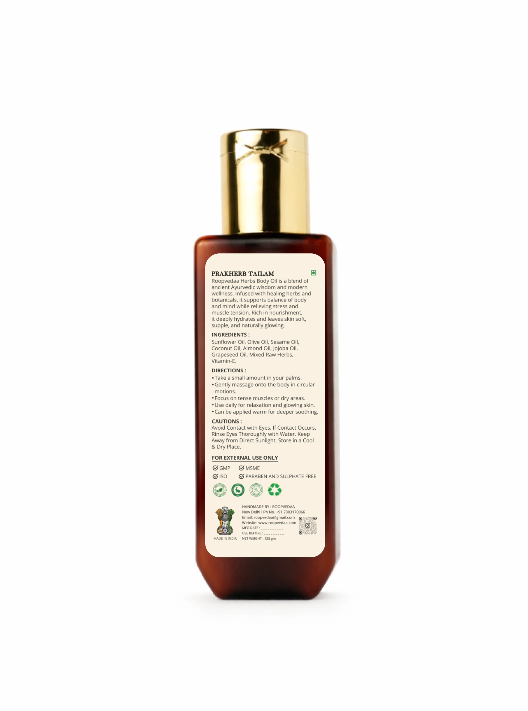 Prakherb Tailam is a nourishing Ayurvedic body oil crafted with a blend of natural carrier oils and mixed raw herbs. Designed to support relaxation, ease muscle tension, and deeply hydrate the skin, this oil helps restore balance to body and mind. With regular use, it leaves the skin soft, supple, and naturally glowing—ideal for daily massage and self-care rituals.