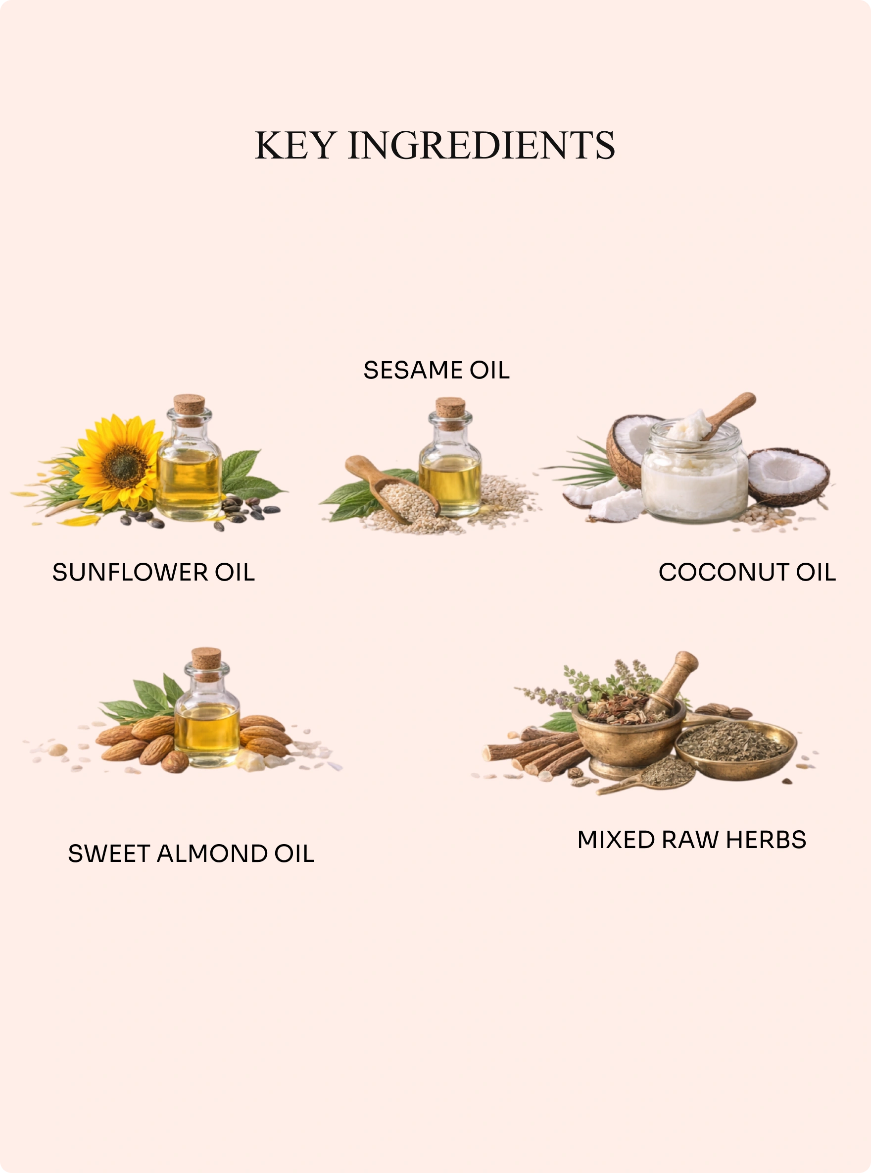 Sunflower Oil, Olive Oil, Sesame Oil, Coconut Oil, Almond Oil, Jojoba Oil, Grapeseed Oil, Mixed Raw Herbs, Vitamin E.
