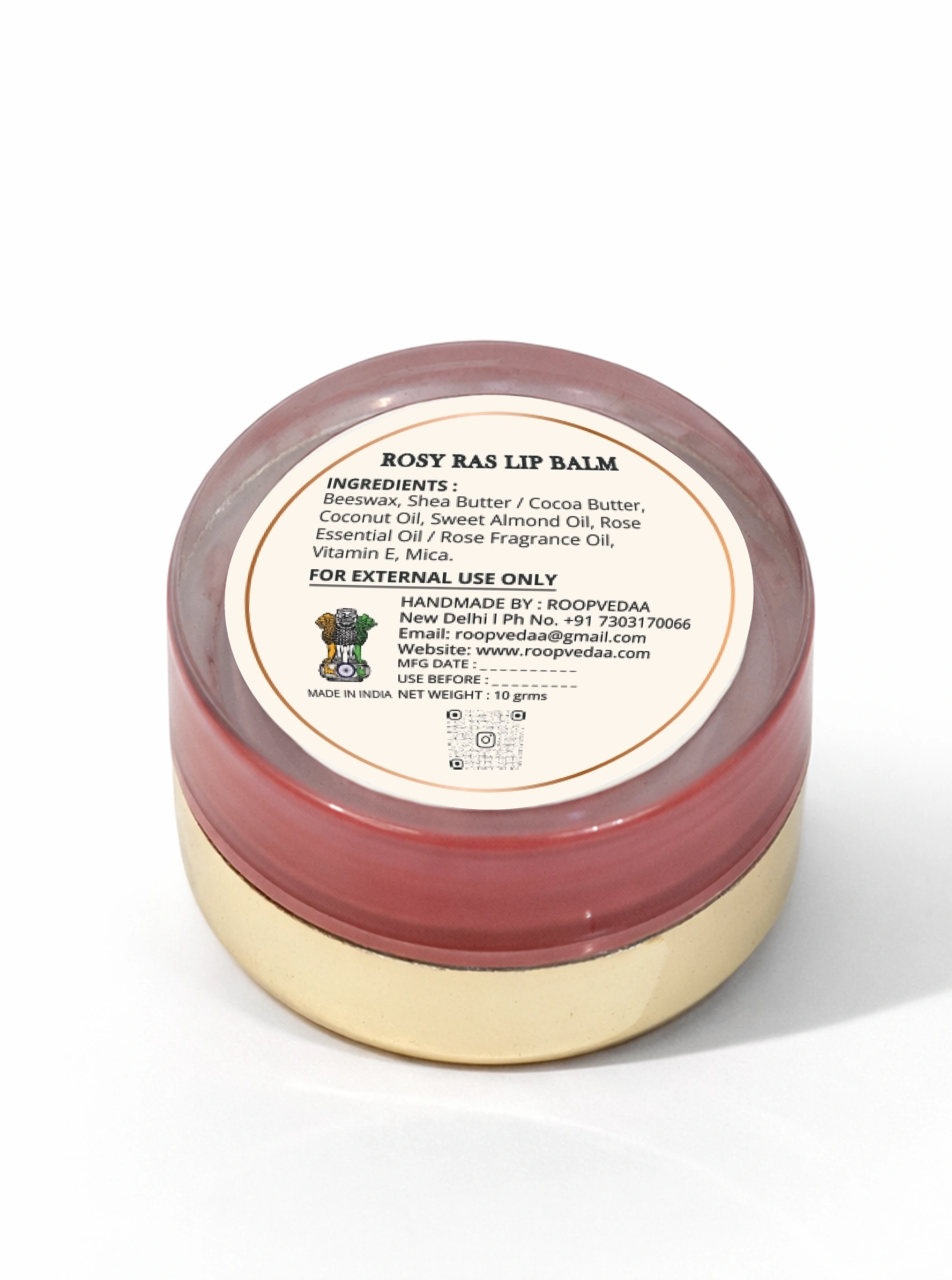 Rosy Ras Lip Balm is a rich, nourishing lip care formula designed to deeply hydrate, repair, and protect dry, chapped lips while adding a soft, rosy touch. Enriched with Beeswax, Shea/Cocoa Butter, Coconut Oil, Sweet Almond Oil, Rose Essential Oil, and Vitamin E, it helps lock in moisture, heal cracked lips, and maintain smoothness. The soothing rose essence adds a pleasant aroma while the creamy texture glides effortlessly, forming a protective barrier against dryness and environmental damage. With regular use, it keeps the lips soft, plump, and naturally healthy-looking.