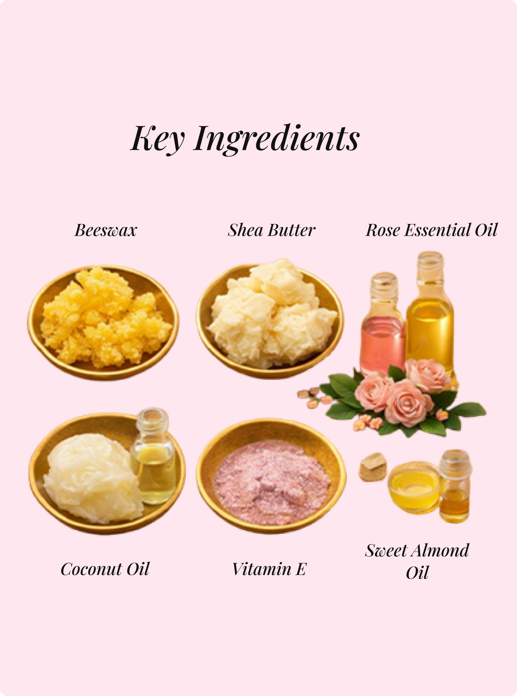 Beeswax, Shea Butter / Cocoa Butter, Coconut Oil, Sweet Almond Oil, Rose Essential Oil / Rose Fragrance Oil, Vitamin E, and Mica.