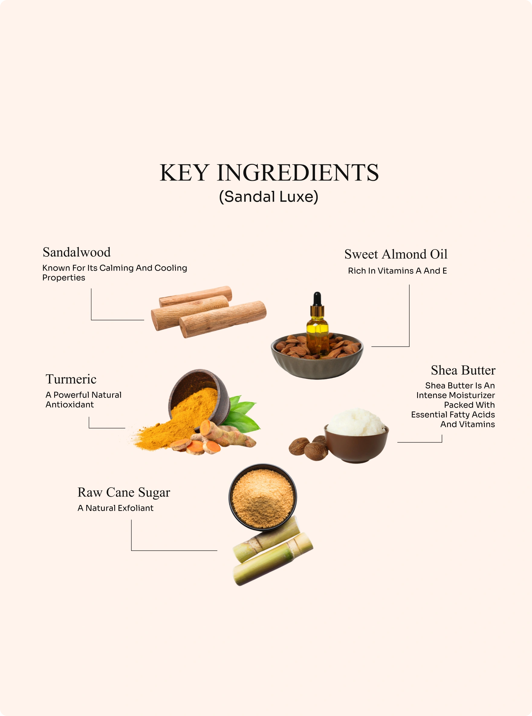 Sandalwood, Turmeric, Sweet Almond Oil, Shea Butter, Raw Cane Sugar, and Gokharu.