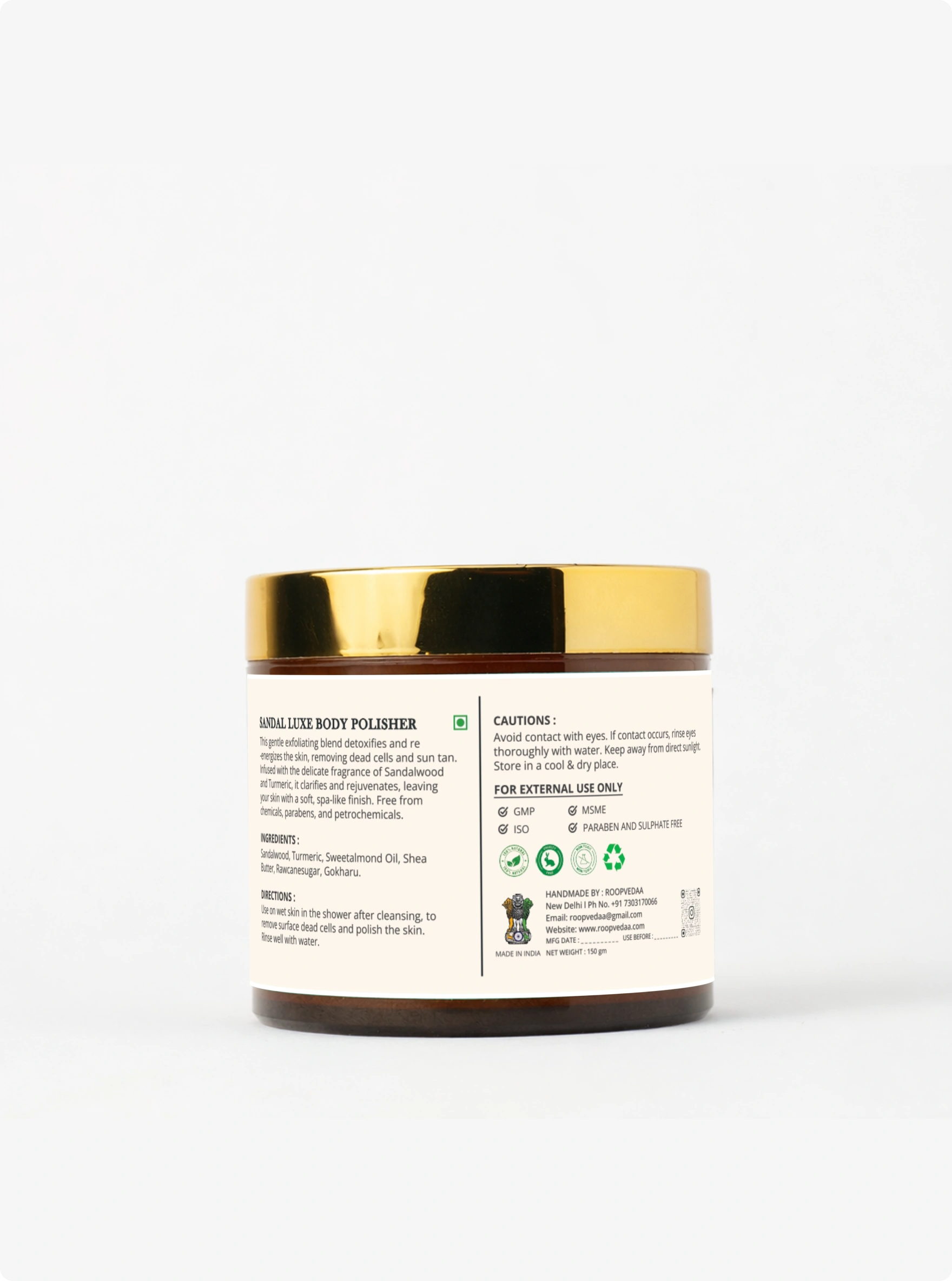 Sandal Luxe Body Polisher is a luxurious exfoliating body treatment designed to detoxify the skin, remove dead cells, and reduce suntan while reviving the skin’s natural radiance. Enriched with powerful natural ingredients like Sandalwood, Turmeric, Sweet Almond Oil, Shea Butter, and Raw Cane Sugar, it helps clarify, smoothen, and rejuvenate dull, tired skin. While sandalwood and turmeric work to brighten and soothe, nourishing butters and oils deeply hydrate, leaving the skin soft, supple, and polished with a spa-like finish. Free from harsh chemicals, parabens, sulphates, and petrochemicals, this body polisher offers a gentle yet effective skin renewal experience.