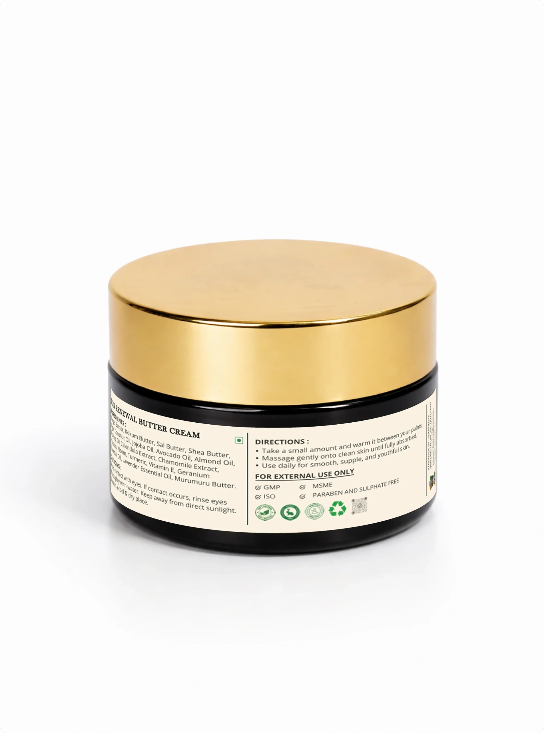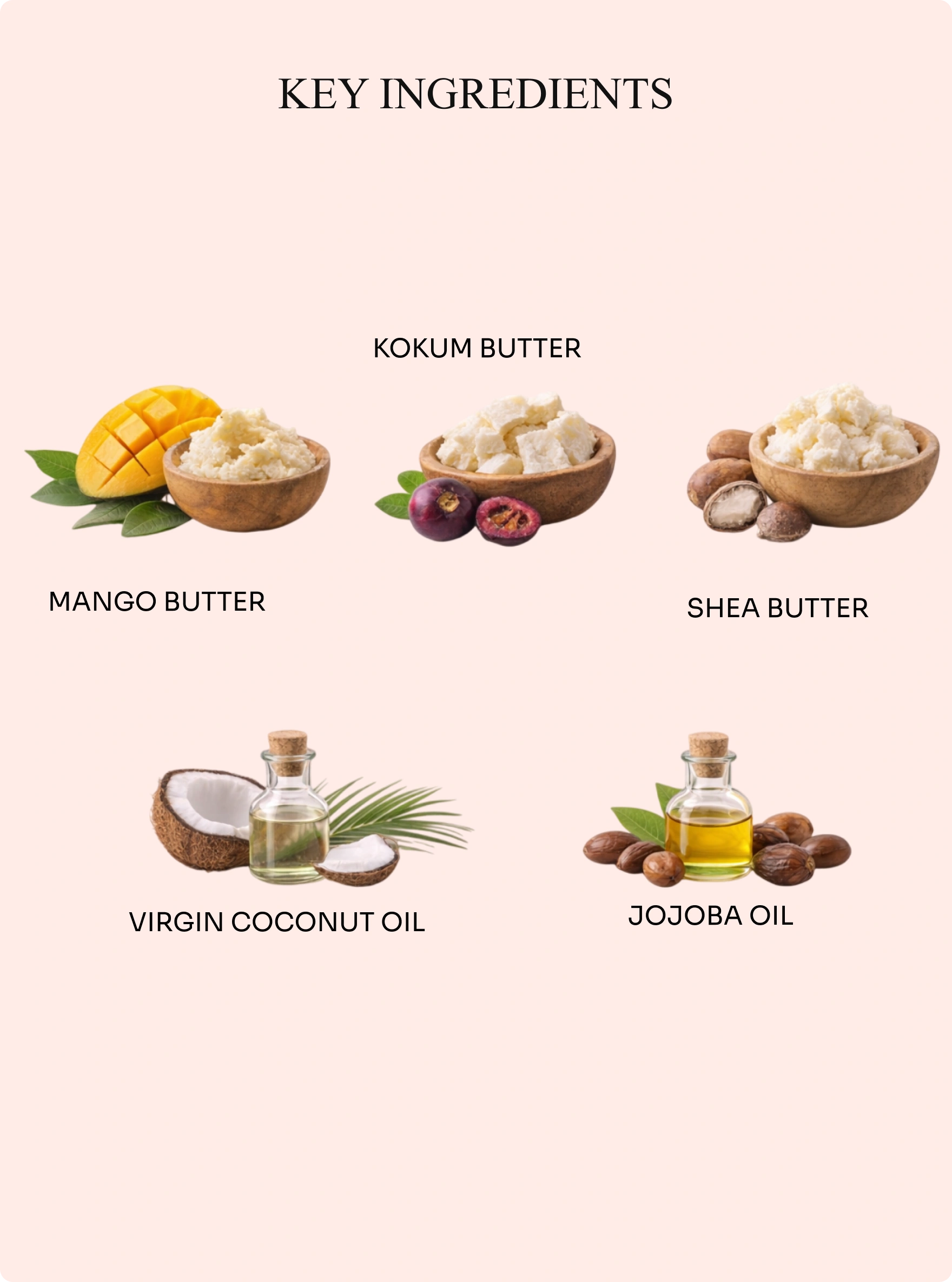 Mango butter, kokum butter, sal butter, shea butter, virgin coconut oil, jojoba oil, avocado oil, almond oil, rosehip oil, calendula extract, chamomile extract, hibiscus, neem, turmeric, vitamin E, geranium essential oil, lavender essential oil, and murumuru butter.