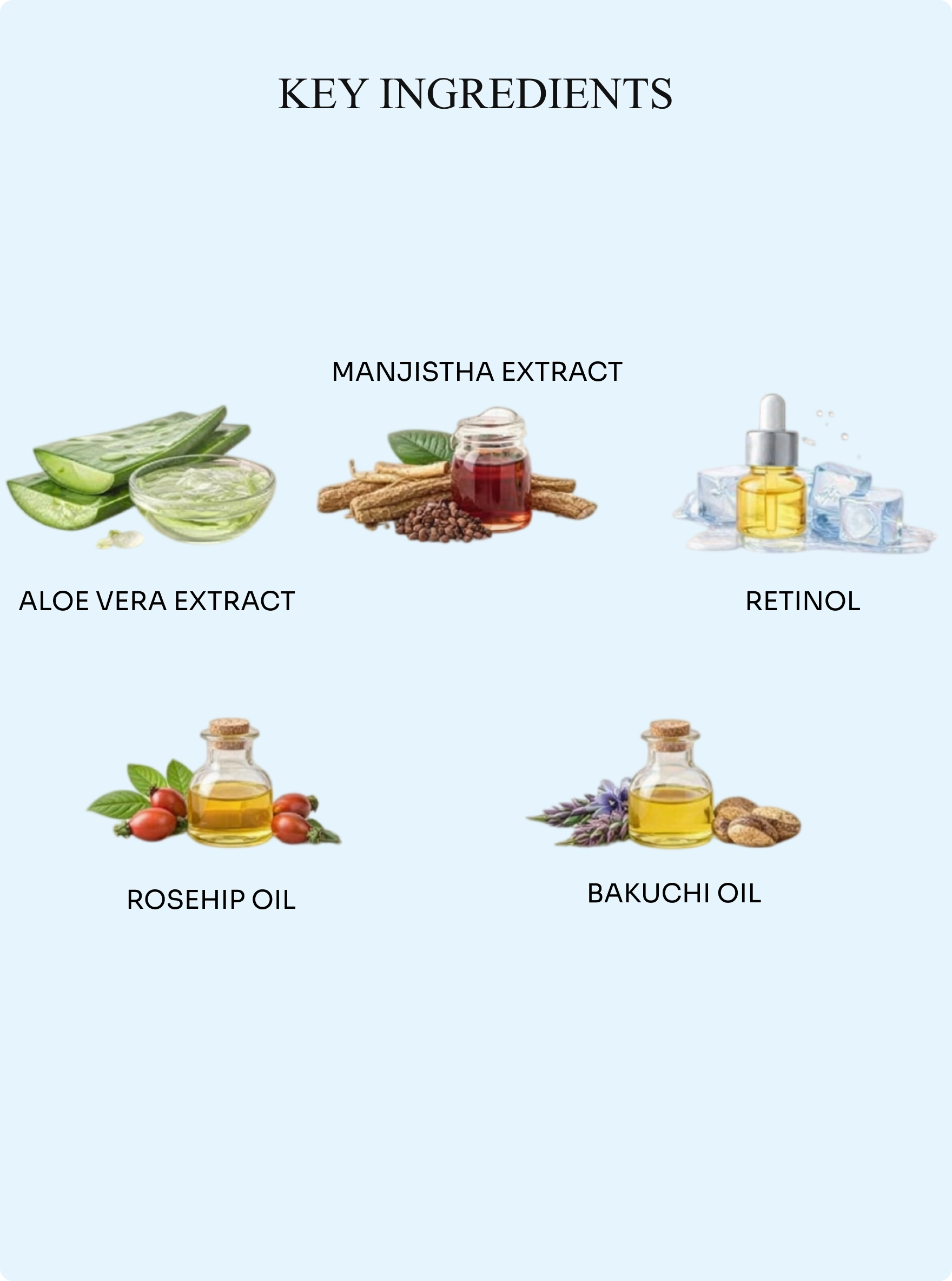 Aloe vera extract, rose hydrosol, manjistha hydrosol, manjistha extract, retinol, kojic acid, geranium oil, rosehip oil, argan oil, emulsifier, paraben-free preservative, and bakuchi oil.