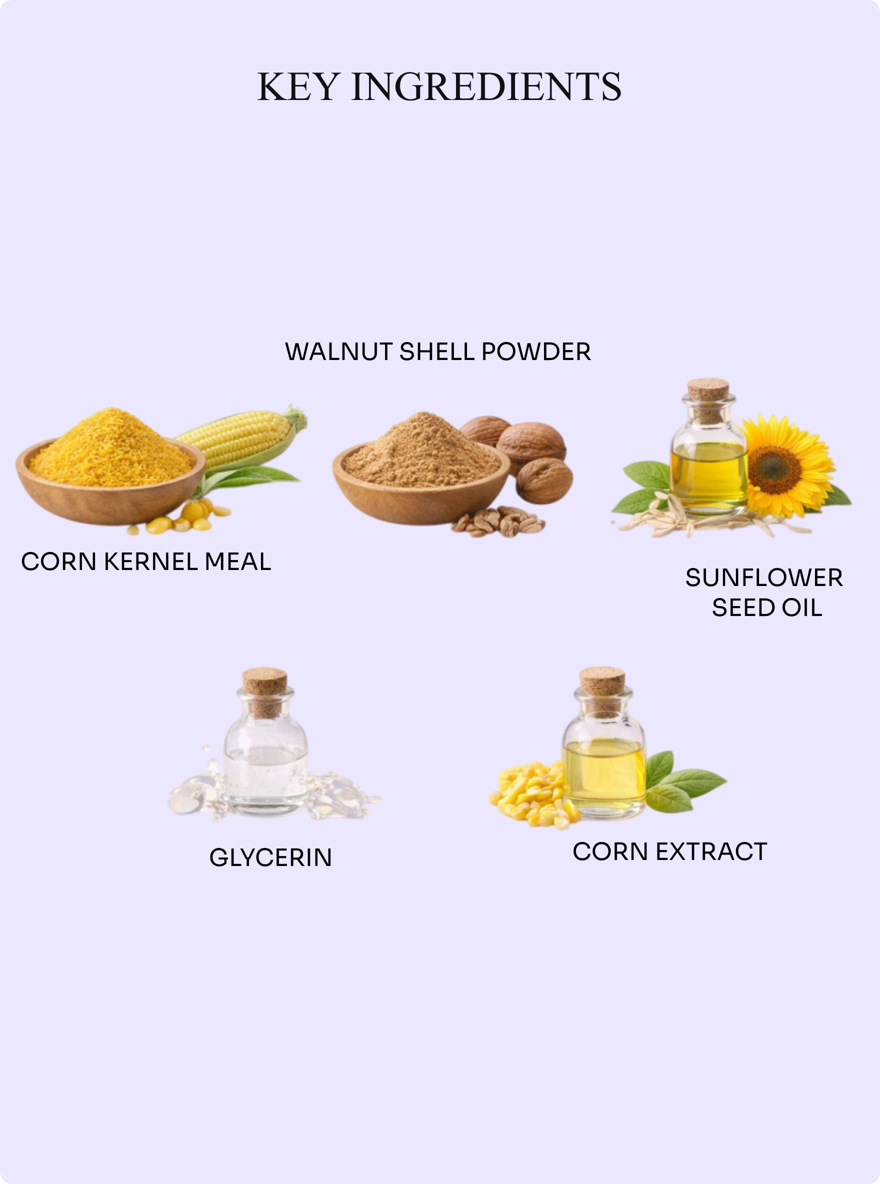 - Corn Kernel Meal (Zea Mays) – Acts as a gentle natural exfoliant to help remove surface buildup.