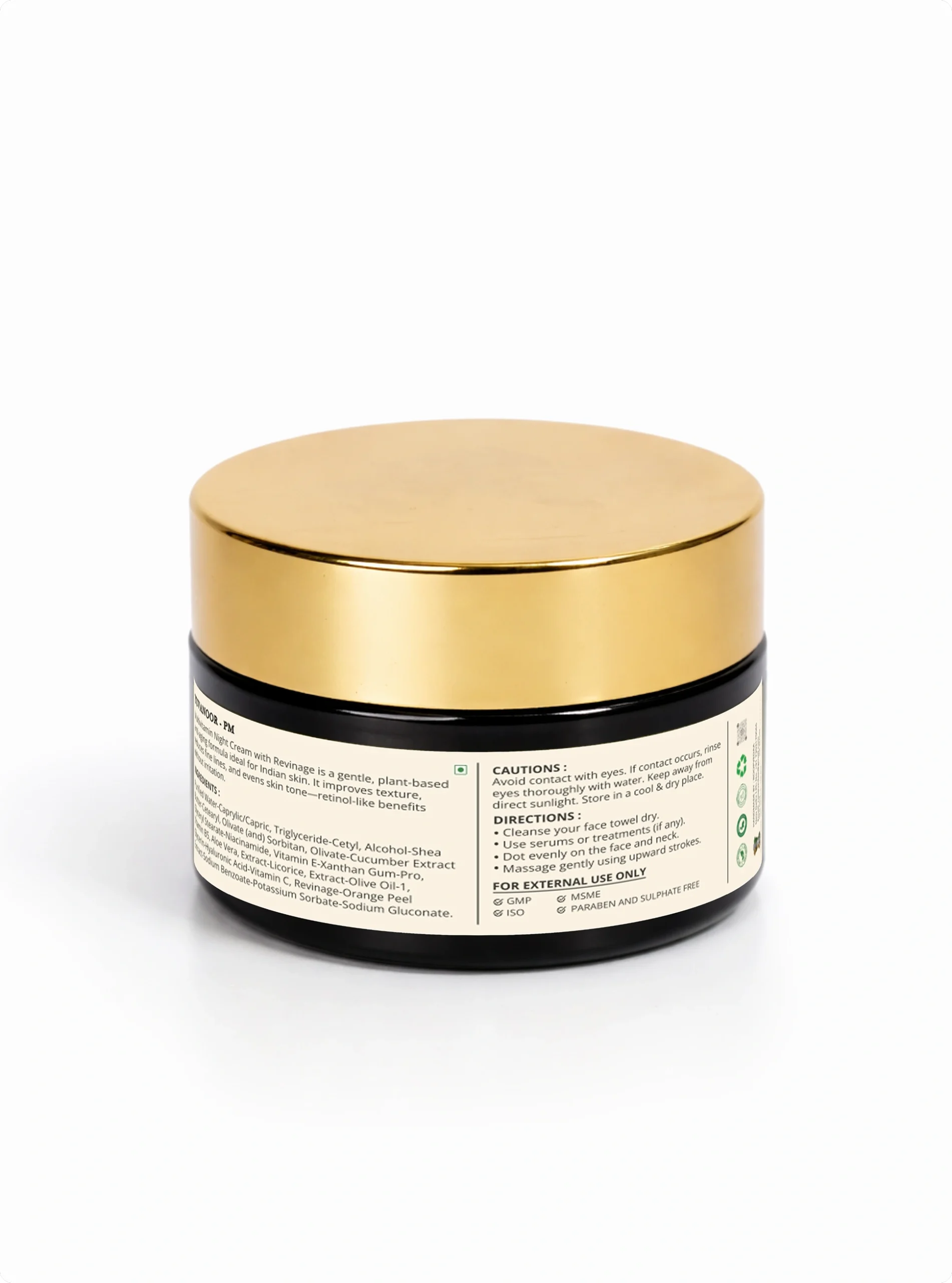 Yuvanoor – PM Multivitamin Night Cream with Revinage is a gentle, plant-based night cream formulated to improve skin texture, reduce fine lines, and even out skin tone while you sleep. Designed specifically with Indian skin needs in mind, it delivers retinol-like anti-aging benefits without the irritation commonly associated with retinol. The formula focuses on overnight repair, hydration, and skin renewal.