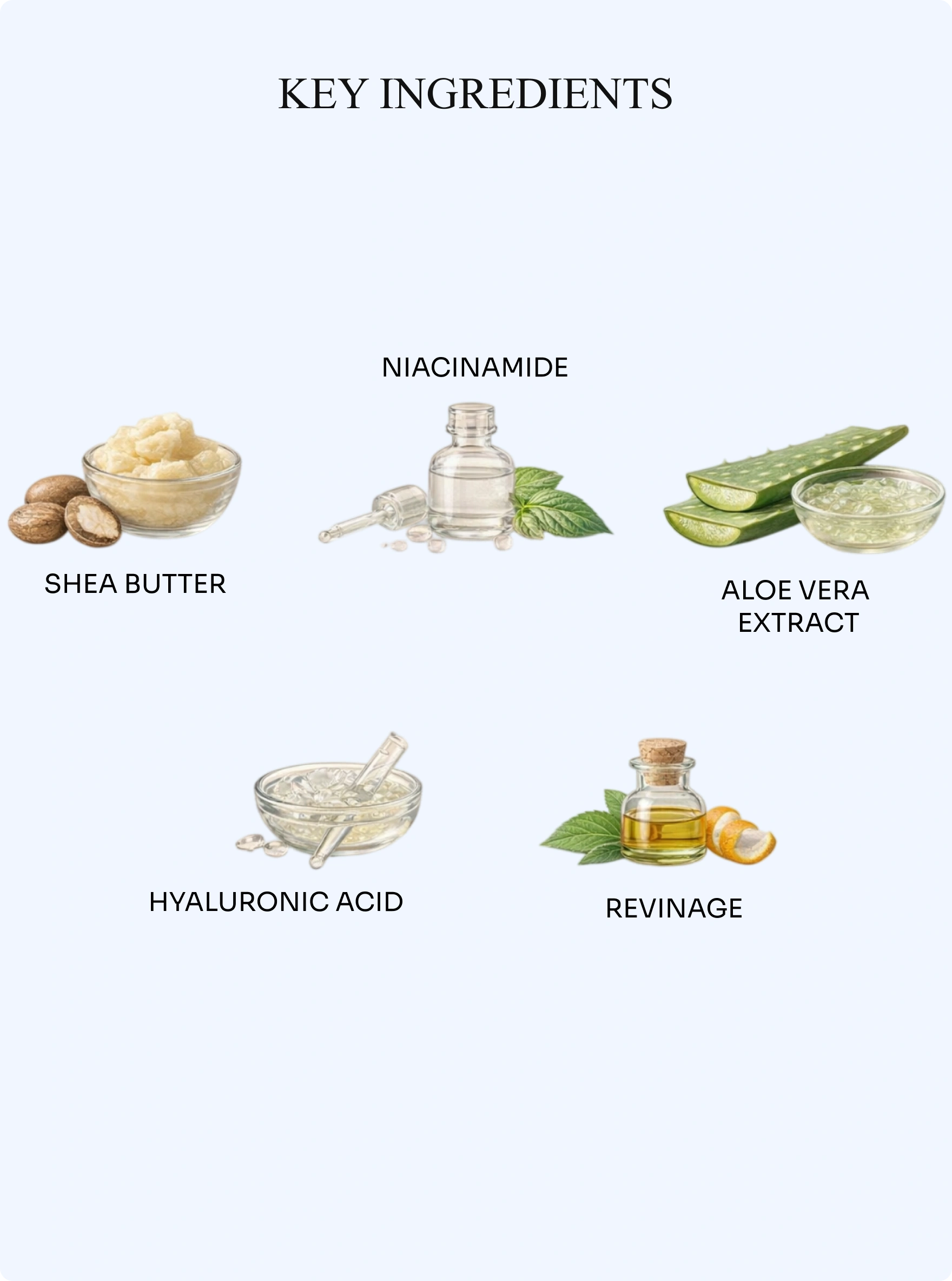 Purified Water, Caprylic/Capric Triglyceride, Cetyl Alcohol, Shea Butter, Cetearyl Olivate & Sorbitan Olivate, Cucumber Extract, Glyceryl Stearate, Niacinamide, Vitamin E, Xanthan Gum, Pro-Vitamin B5, Aloe Vera Extract, Licorice Extract, Olive Oil, Glycerin, Hyaluronic Acid, Vitamin C, Revinage (Orange Peel Extract), Sodium Benzoate, Potassium Sorbate, Sodium Gluconate.
